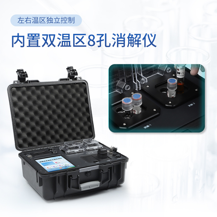4、内置双温区8孔消解仪,左右温区独立控制,可对COD总磷总氮等进行快速消解。