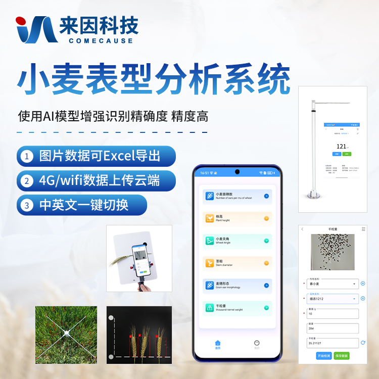 4)麦穗形态测定仪依托手机视觉技术,通过AI图像矫正算法一键获取穗长、小穗数等关键指标。全系统实现田间快速取样、批量分析及数据互联,为育种优化、产量预测和功能基因解析提供智能化解决方案。