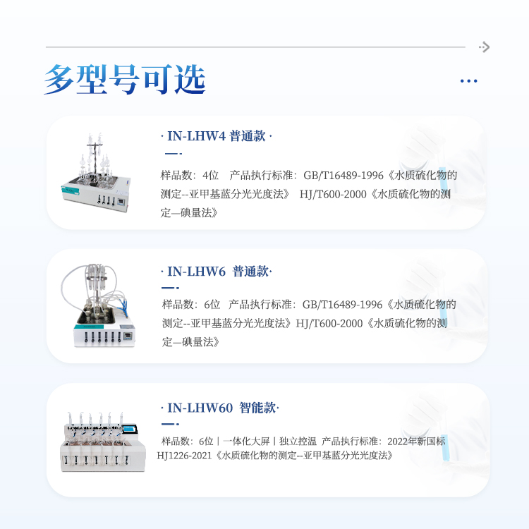 水样中的硫化物经酸化,生成的硫化氢随载气(氮气)进入吸收瓶/吸收显色管中被吸收溶液(乙酸锌-乙酸钠溶液或2%氢氧化钠溶液)吸收,选择相应的分析方法对吸收瓶/吸收显色管中吸收的硫离子进行分析测定。水质硫化物酸化吹气仪根据2022年新国标水质硫化物的测定-亚甲基蓝分光光度法(典量法)标准开发生产的。水质硫化物测定的样品前处理需要。